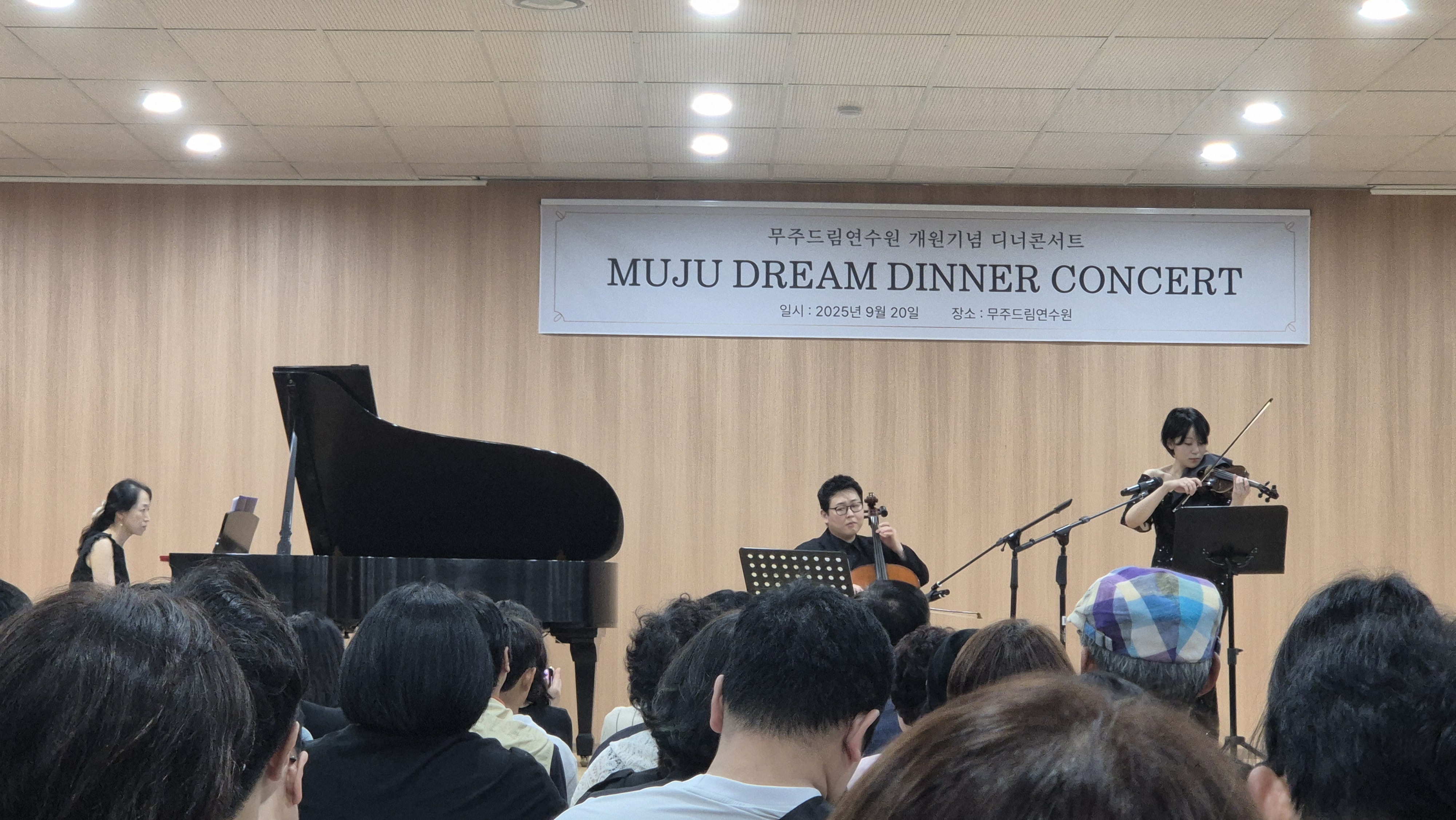지난 5월 개원한 무주 드림연수원(대표이사 김윤종)이 9월 20일 저녁, 개원을 기념하는 디너 콘서트를 개최했다.” 이번 행사는 많은 무주군민이 참석한 가운데 호텔식 뷔페와 수준 높은 클래식 공연이 어우러진 힐링의 무대로 꾸며졌다.